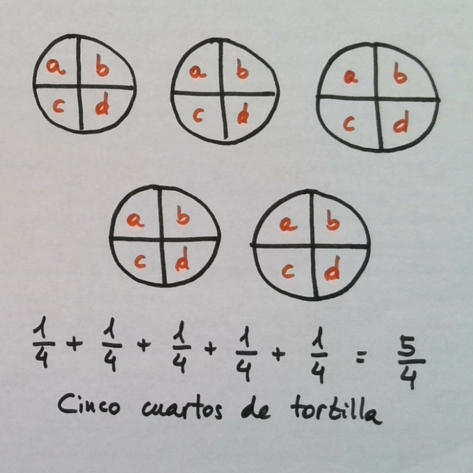 Y después, en una segunda fase, esa tortilla que sobra, la partiría en 4 (si quiero terminar ya), y daría uno de esos trozos a cada participante. Cada uno recibiría una tortilla entera y un cuarto. Es decir, $1+1/4$.