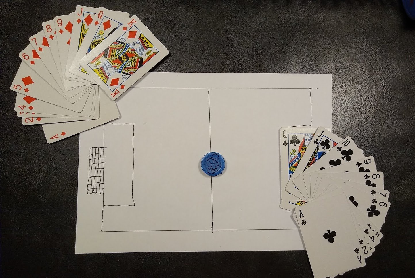En cada turno, los jugadores eligen una carta cada uno y la revelan al mismo tiempo. Si la carta del rojo gana a la del negro, la pelota avanza hacia la portería del negro.